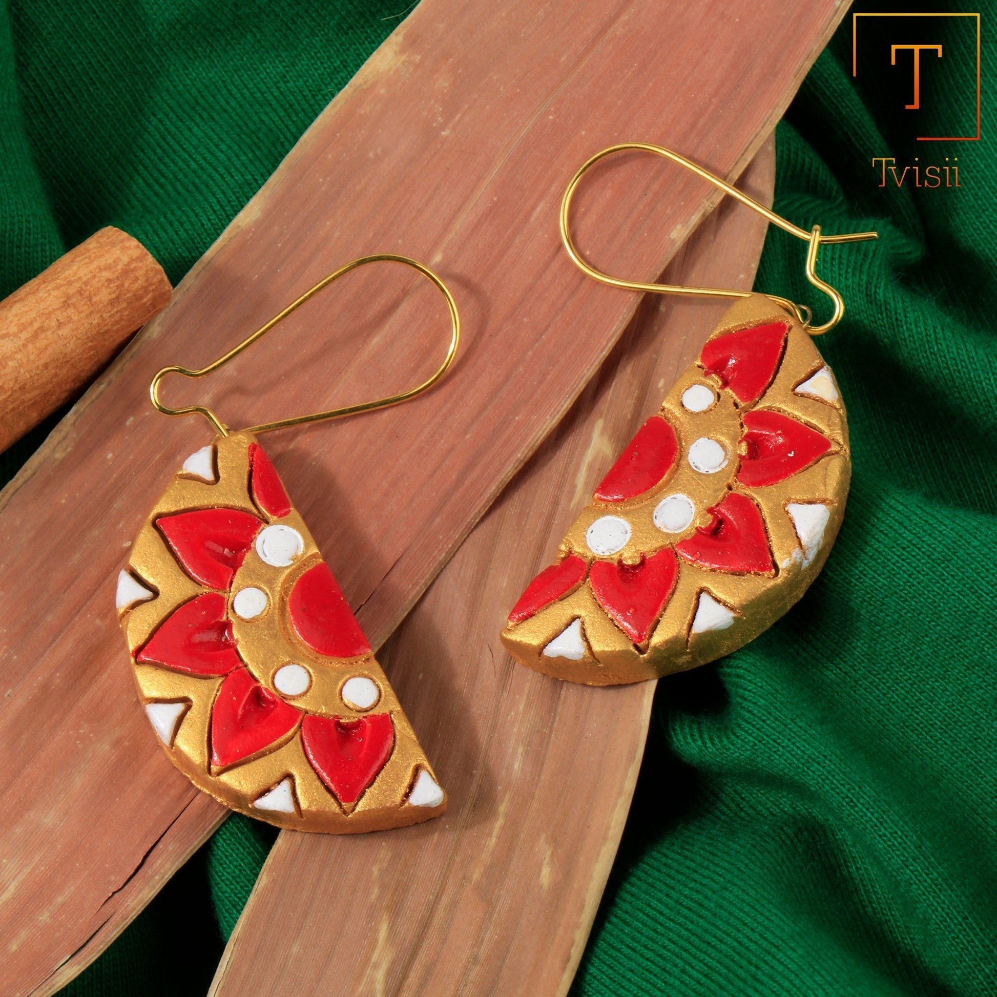 These������ red and golden����"1">������earrings are made up of brownish red coloured and unglazed clay . They have been beautifully crafted by the very talented karigars of Madhya Pradesh using #deshkimitti. They're pure markers of #madeinIndia . #BeVocalForLocal and buy from our beautiful Argil Collection