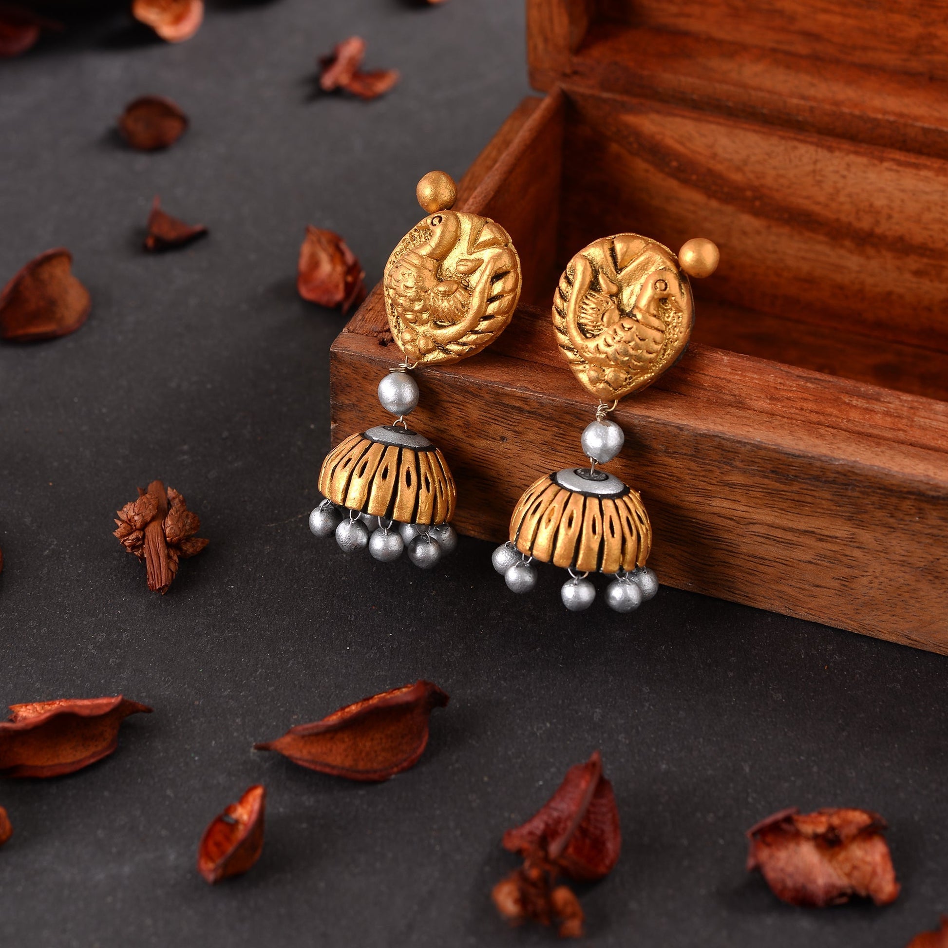 These golden gorgeous looking earthen������earrings are made up of brownish red coloured and unglazed clay . They have been beautifully crafted by the very talented karigars of Madhya Pradesh using #deshkimitti. They're pure markers of #madeinIndia . #BeVocalForLocal and buy from our beautiful Argil Collection